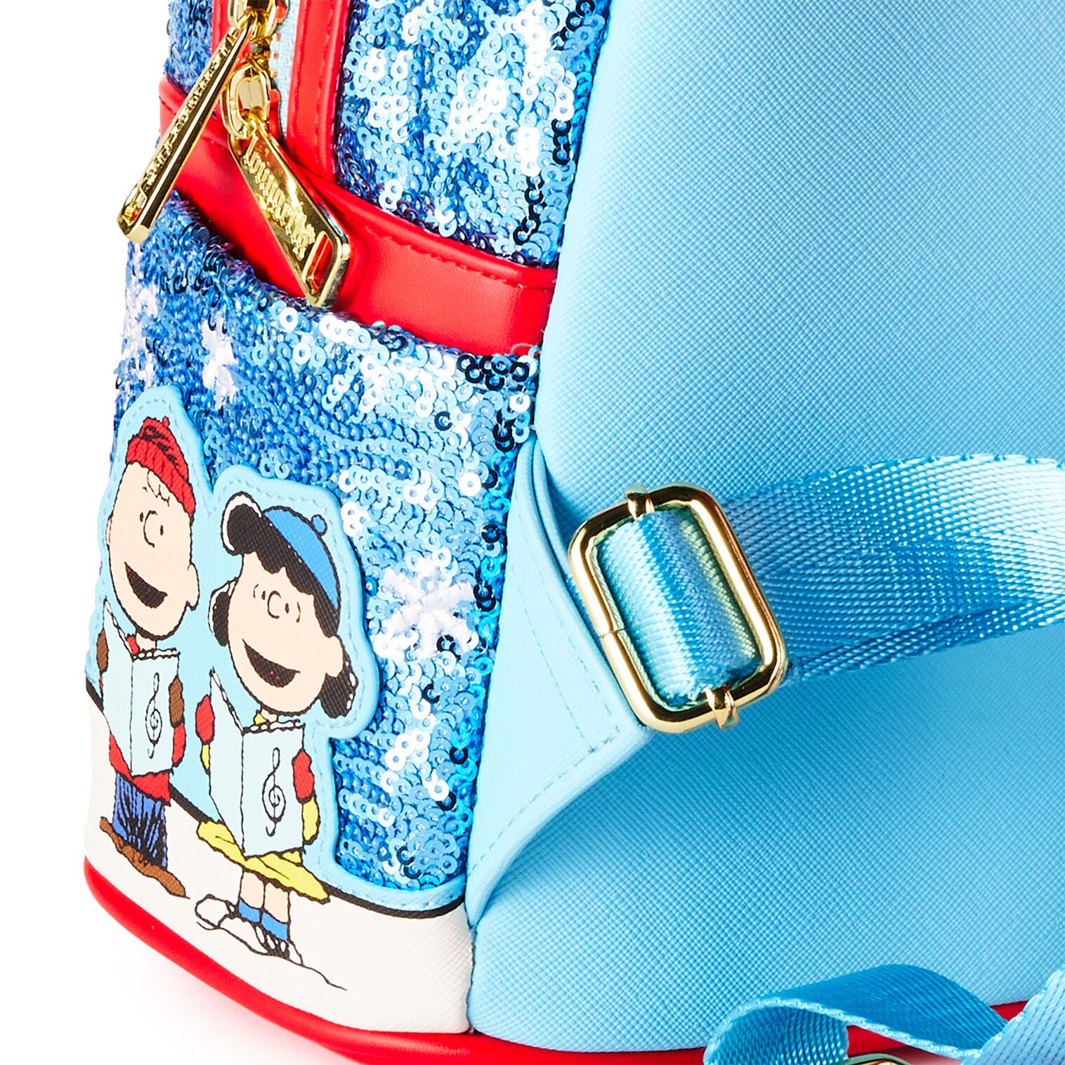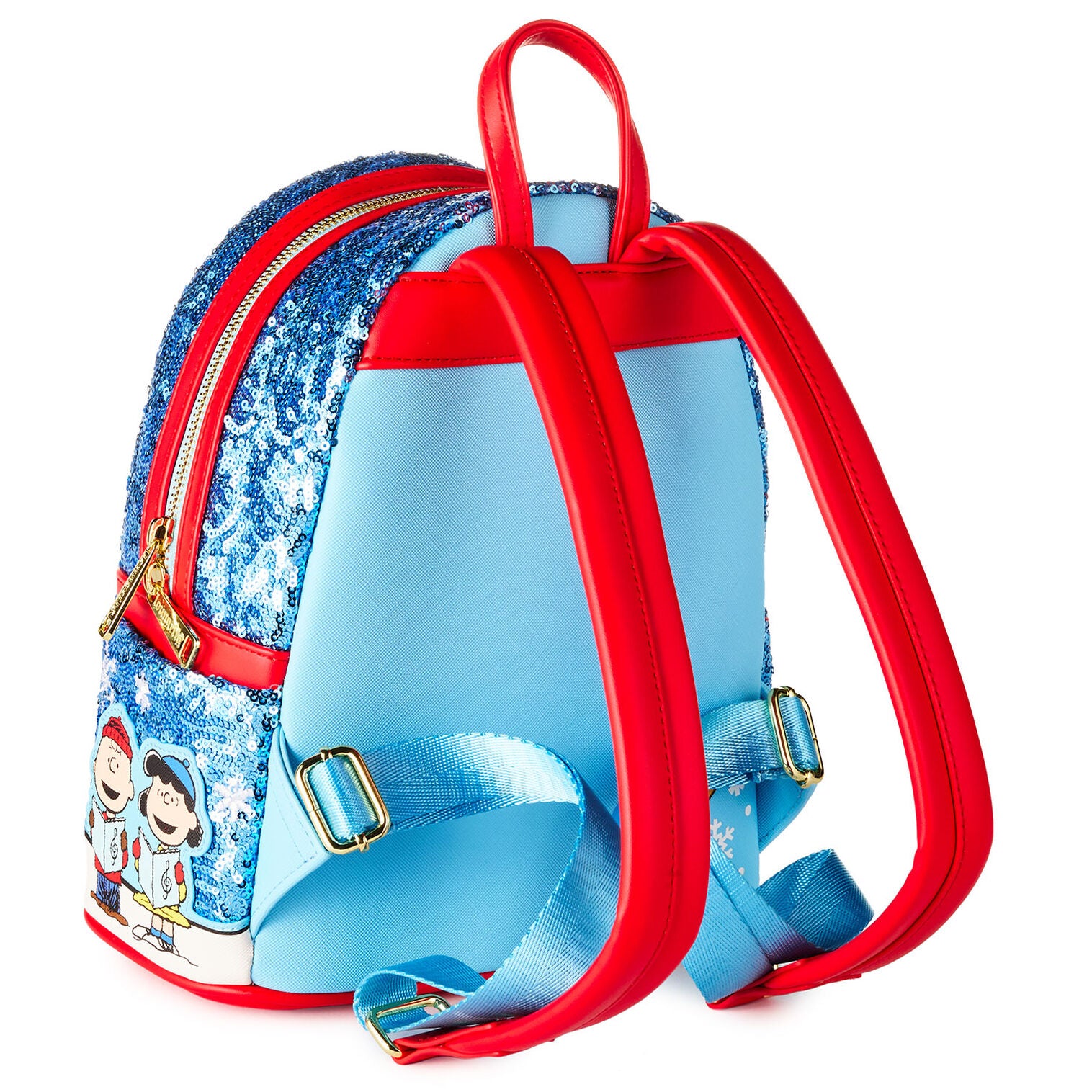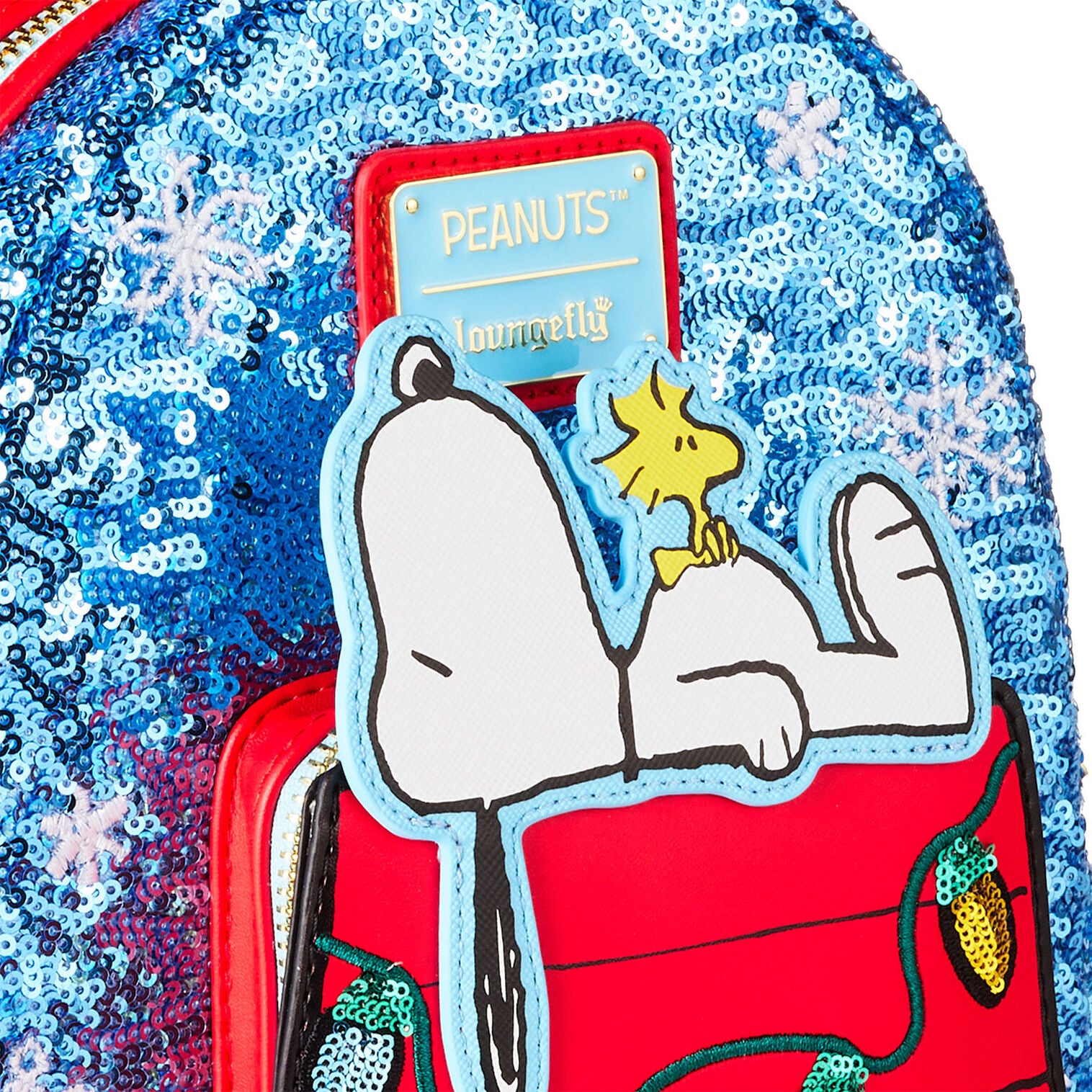 Celebrate the season in style with this sparkly Snoopy and Woodstock mini backpack from Loungefly — a Hallmark-exclusive design that’s full of holiday cheer. The blue, red and white bag features Snoopy snoozing atop his doghouse that's been decked out in sequin Christmas lights, while Woodstock happily sits on his tummy watching snowflakes fall. Crafted from premium faux leather with delicate embroidered details and a sky full of blue sequins, this whimsical winter accessory is both playful and practical. A delightful gift for Peanuts fans, it’s the perfect companion for spreading joy all season long.